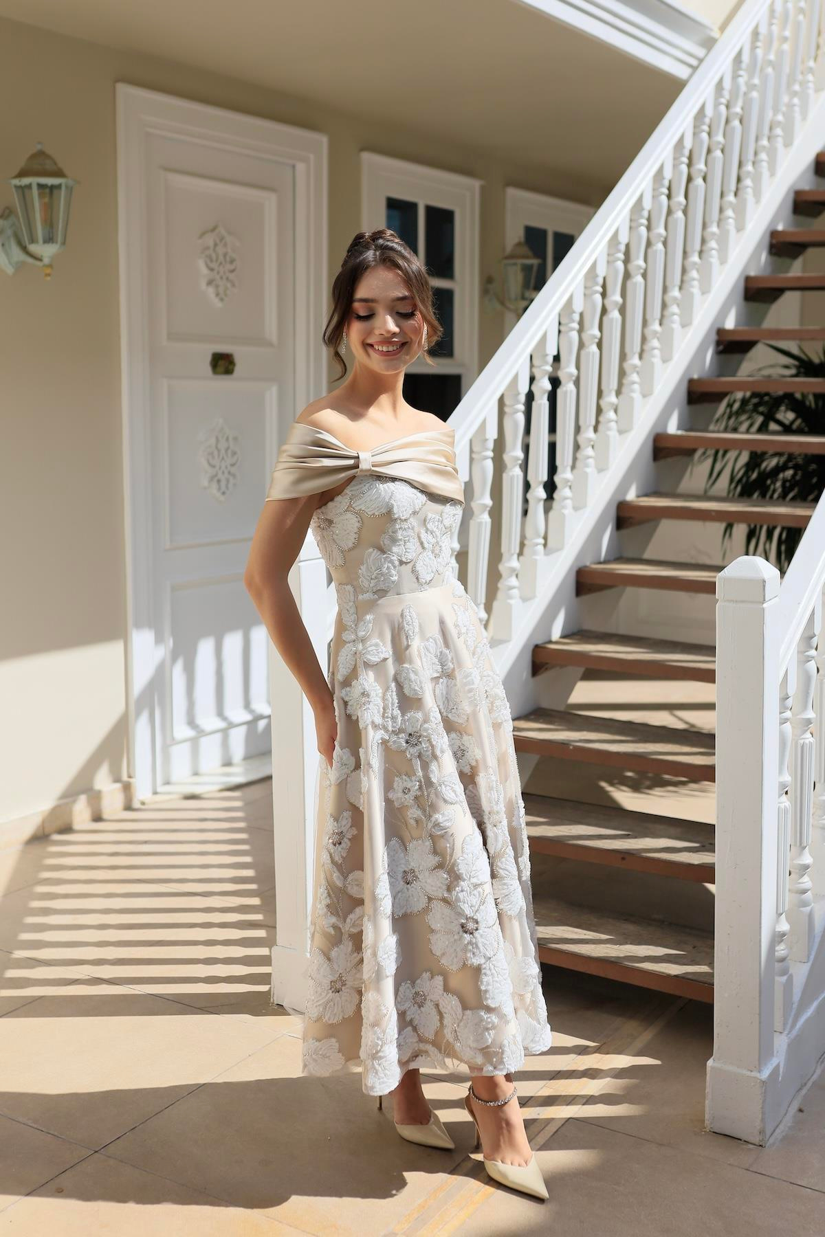 Sindirella Prenses Beyaz Bej Saten Bolero Çiçekli Özel Tasarım Dantel Abiye Elbise