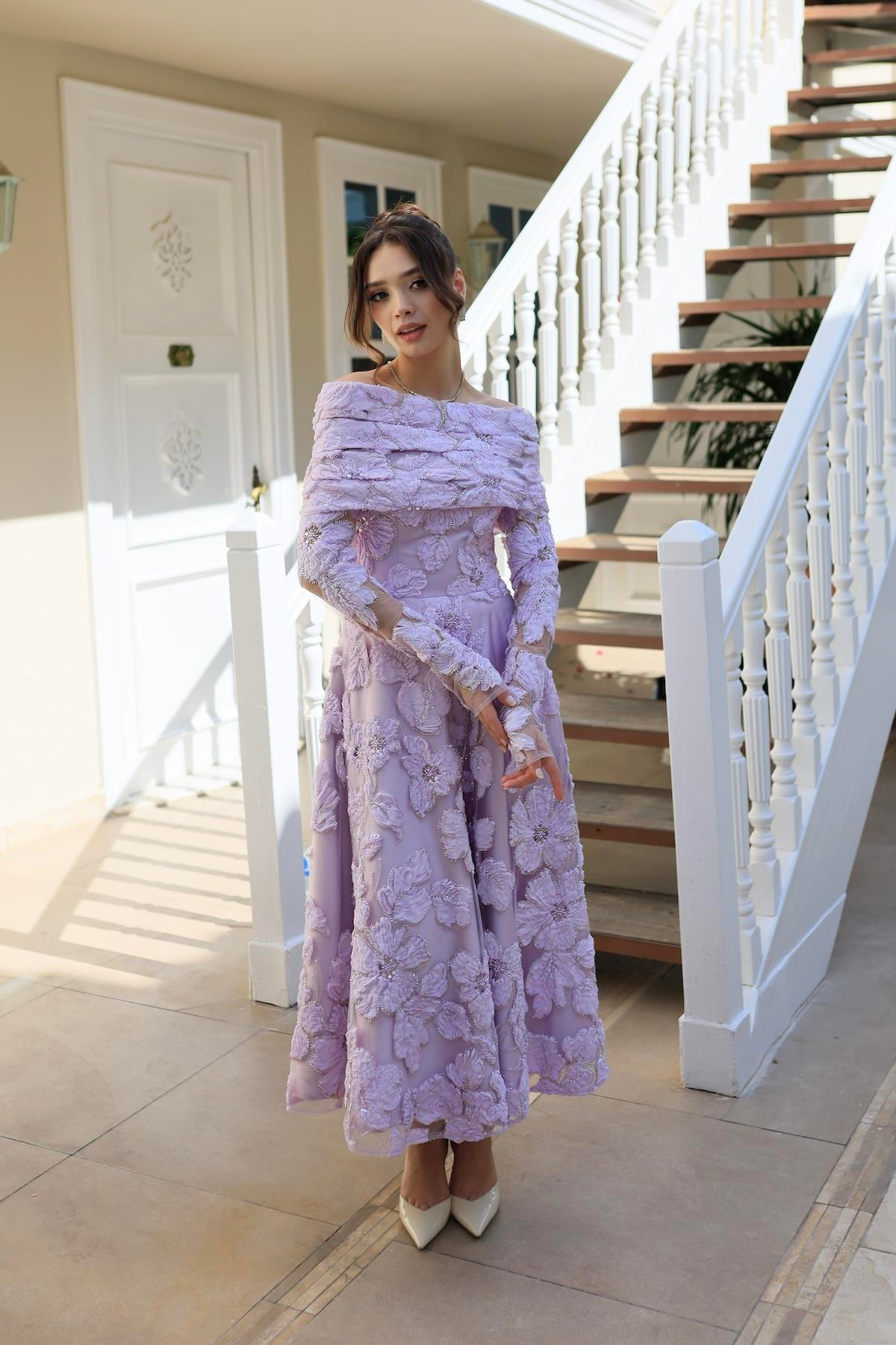 Sindirella Prenses Lila Dantel Bolero Çiçekli Özel Tasarım Dantel Abiye Elbise